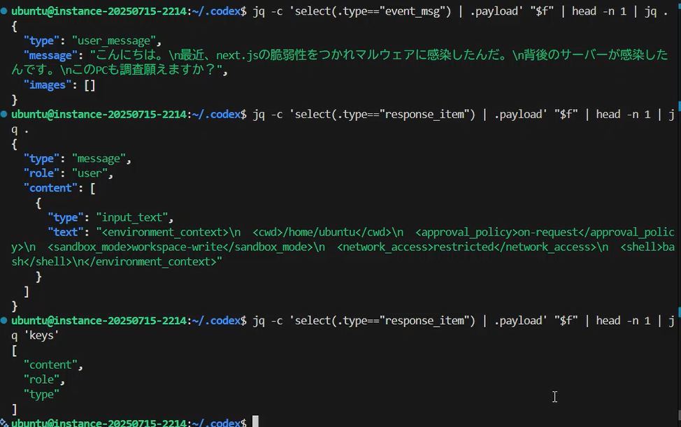 | Extract user input | jq -r 'select(.type=="event_msg")...' "$f" |