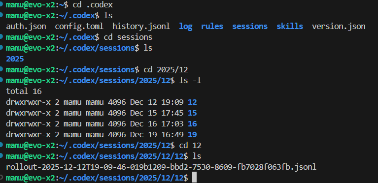 Logs are organized by date. Since there may be multiple files per day, you first need to narrow down “which one to read.” Generally, start with the most recent rollout-*.jsonl file.