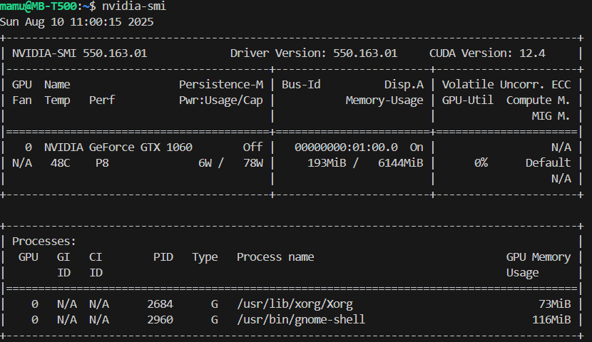 My GTX 1060 reports support for up to CUDA 12.4 when checking with nvidia-smi. However, NVIDIA’s official support matrix for Linux only lists up to Ubuntu 22.04. The problem is, this machine is running Ubuntu 24.04.