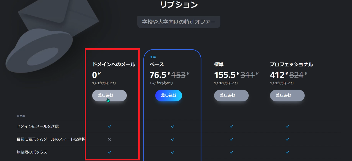 I lived in Russia for about a year, but I’ll translate it into Japanese and click the link at the bottom of the page. The plans will be displayed, so select the one on the far left that allows you to use a domain email for free.