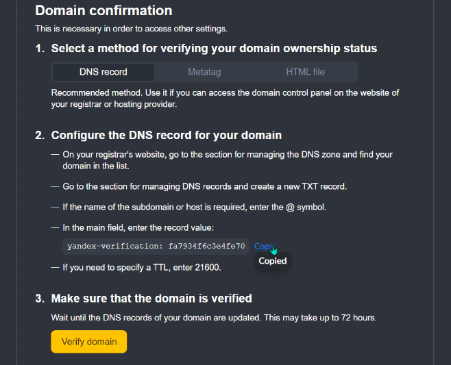 - Click “Verify” in the Yandex admin panel.