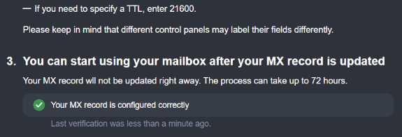 - MX record: “Your MX record is configured correctly”